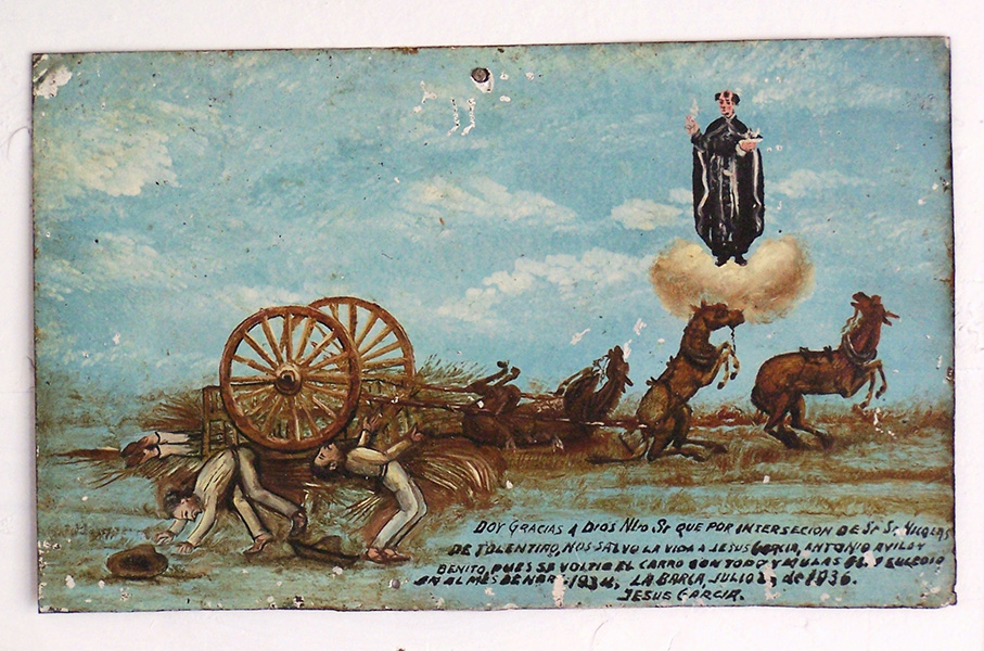“I give thanks to God Our Lord for [the] intercession of St Nicholas of Tolentino [who] saved the life of Jesús García, Antonio Ávila y Benito, for his cart overturned with everything and the mules . . . and it happened in in the month of Nar (sic) 1934, La Barca, July 1936. Jesús García”